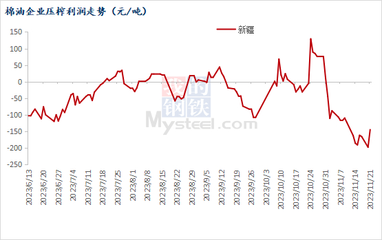 原料棉籽:截至11月21日,山东市场新疆新季棉籽价格3400元/吨;新疆阿克苏市场新季棉籽价格2870元/吨,贸易商前期拿货价较高,在买卖双方博弈下,棉籽价格暂无下行空间,扎花厂对棉籽挺价心态也有所增强,目前来看的话下游牧场及油厂采购积极性不高,一反面是下半年养殖行业不景气,企业暂无多余资金做采购,另一方面厂商对棉籽质量把控较为苛刻,市场采购较为谨慎。