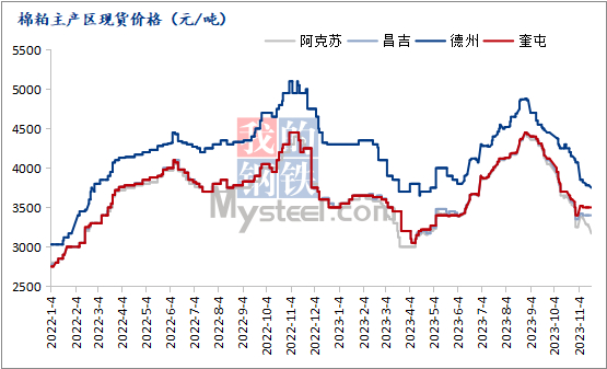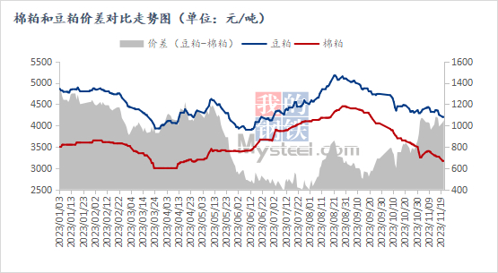 纵观2023年来看,8-9月份因棉粕市场供应紧缺,新季棉花还未上市,市场炒作热度持续上升,企业对棉粕报价依旧高位坚挺,而第四季度来临,新季棉籽上市推迟,油厂因开工盈利困难,棉粕价格呈现下滑趋势,虽11月初供应量减少,短暂支撑了棉粕价格,但棉粕与豆粕没有性价比优势,棉粕需求也是整体受限,使至近期市场行情震荡趋弱。截止到2023年11月21日,较月初相比,新疆阿克苏主产区从3250元/吨跌至3170元/吨,跌幅2.46%;山东德州主产区从4070元/吨跌至3750元/吨,跌幅22.11%。近期价格波动主要受原料、其他副产品和下游需求影响,接下来从以下几个方面进行分析。