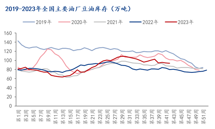 进入四季度,国内豆油库存仍旧处于高位。从国内基本面来看,供应方面,虽然10月份大豆到港量不高,但11月、12月大豆到港量预期在783.25万吨、960万吨,从原料供应角度,大豆到港量较大;需求方面,双节过后,国内豆油市场进入阶段性需求淡季,节后短暂的补货期结束以后,豆油市场迎来阶段性的需求淡季,国内各油厂库存明显增加。截至2023年第45周,据Mysteel农产品调研数据显示,国内豆油商业库存为92.95万吨,较2023年第44周(94万吨)减少1.05万吨,降幅1.12%。从目前供需情况来看,未来大豆到港量增多,油厂压榨量继续增加,而需求拐点预计在12中下旬来临,因此,目前来看,豆油商业库存仍将在高位徘徊。