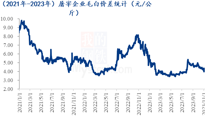 2021年-2022年5月毛白差持续减少,主要是猪价持续跌跌不休,猪肉价格跟跌,受买涨不买跌情绪影响,猪肉产品销售难度较大,猪肉跌幅超过猪价,加之2021年猪肉价格高位,高价猪肉抑制终端消费,因此屠宰厂毛白差持续缩水。2022年5-11月随着毛猪处于低位,低价猪肉不断刺激消费,加之业者对后市行情看好,无论是鲜品备货还是冻品入库,屠宰企业猪肉消化顺畅,因此毛白差涨至高点8.12元/公斤。后期随着猪价缩水,毛白差逐步恢复正常水平(4-6元/公斤),而且2023年来看,企业毛白差明显缩减,全年毛白价差均值为4.16元/公斤,同比跌幅23.25%。全年猪肉产量偏多,市场消费不及预期,猪价虽然走高,但肉价跟涨不及时,屠宰厂毛白差缩水。