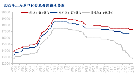 以上海港市场价格为例,截至12月13日,秘鲁超级鱼粉主流价格为17300-17400元/吨,环比上月下调200元/吨,日本级鱼粉主流价格为16600-16800元/吨,环比上月下调400元/吨,普通级鱼粉主流价格为12700-13000元/吨,环比上月下调2000-2200元/吨,跌幅明显。国产方面,山东地区鱼粉厂家65%蛋白出厂价11000元/吨,较上周上调500元/吨,67蛋白鱼粉出厂价11700-12000元/吨,较上周上调200元/吨。由于成本、库存、资金、品质等差异,鱼粉市场报价不一,实单议价成交。