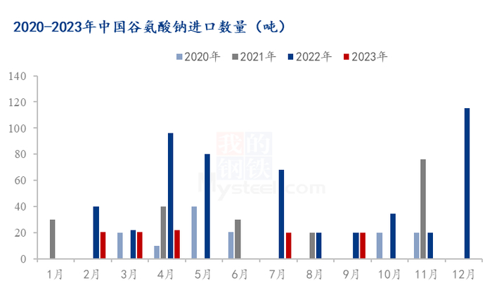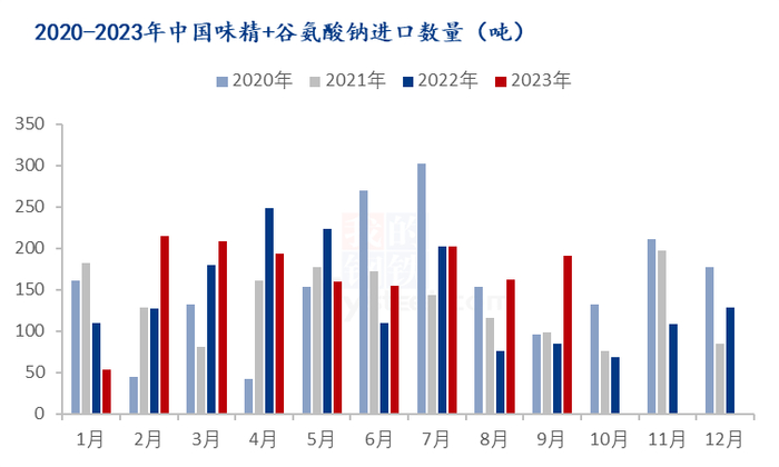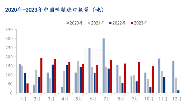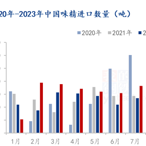 截至2023年1-11月国内谷氨酸钠进口量累计103.23吨,较去年同期346.45吨减少243.22吨,减幅70.20%。