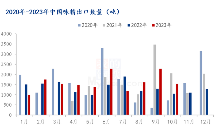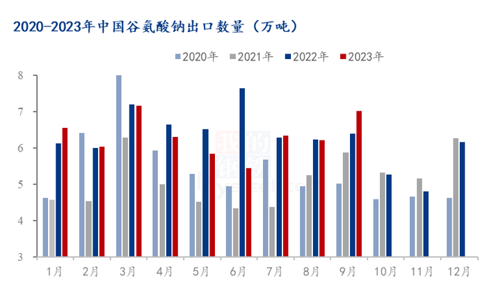 截至2023年1-11月国内谷氨酸钠出口量累计56.93万吨,较去年同期59.05万吨减少2.12万吨,减幅3.59%。