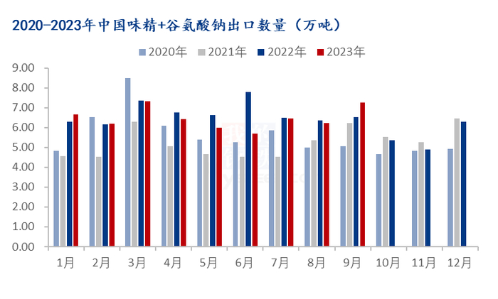 据中国海关数据显示:2023年11月国内谷氨酸钠出口量为7.02万吨,较今年10月6.22万吨增加0.8万吨,环比增加12.86%;较2022年10月6.39万吨增加0.63万吨,同比增加9.86%。