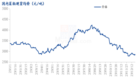 2023年国内主流地区菜粕现货平均价格为3380元/吨,年内最高点为4235元/吨,最低点为2848元/吨,2023年菜粕价格自年初跟随相关蛋白粕下跌明显,且菜粕自身处于新季菜籽到港增量碰撞水产淡季背景下,1月跌势延续到3月。一季度菜粕价格震荡弱势运行,由于加籽到港量处于高位,菜粕价格不管是单边还是价差,都处于相对弱势。随着菜粕性价比的提升,菜粕需求增联合,库存转折点较往年提前,菜粕今年价格自4月初探底回升,且与豆粕价差逐步缩小。4月后菜粕价格震荡向上,并不断突破前高,豆粕上涨带动菜粕的大前提下,菜粕因性价比突出需求在淡季表现亮眼,库存未如预期累库,基本面支撑现货价格。直至8月,菜粕价格出现拐点,全球蛋白粕增产背景下打压国内菜粕价格,二季度至今年8月份,菜粕价格偏强运行,美豆的种植面积下调明显,同时南美面临着干旱的担忧,阿根廷的减产也支撑了全球蛋白粕的价格,菜粕跟随走高。从自身基本面来看,国内菜粕正值水产旺季且市场对于菜籽在三季度到港的担忧也同样支持菜粕价格走强。8月至年底,菜粕的价格下跌明显,国外对于天气的炒作告一段落后,美国打斗的季节性收获压力较大,同时南美的大豆丰产格局不断北市场炒作,葵粕供应也处于近几年高位,全球蛋白粕下跌背景下,菜粕也无法幸免。从基本面角度来看,菜粕的水产旺季结束,虽然性价比凸显,但由于市场对供应预期好转,葵粕的冲击背景下,菜粕价格走弱。10月后国内进口菜籽增量预期较高,菜粕价格一路跌至年内低位区间,直至12月菜粕价格低位震荡,且暂无向上突破动力。