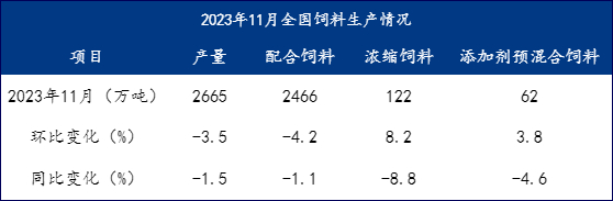 产量数据方面,据中国饲料工业协会统计数据显示,2023年11月,全国工业饲料产量2665万吨,环比下降3.5%,同比下降1.5%。2023年1-11月,全国工业饲料产量累计共28765万吨,同比去年增加1934万吨,增幅7.21%。