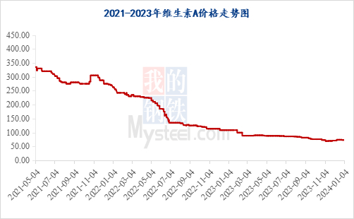 维生素A:2023年全年市场均价85.1元/kg ,较上年均价同比下降84元/kg ,跌幅49.67%。年初帝斯曼工厂暂停维生素A的生产,维生素A产能严重过剩,格局变化复杂 ,各厂家以销定产,市场多以消耗库存为主,而需求持续偏弱,维生素A的价格一直在低位运行,价格已由年初108元/kg跌至年末73元/kg,价格持续小幅下跌。预计2024年一季度维生素A市场仍维持弱稳运行,价格小幅震荡为主,关注工厂出货及下游库存情况。