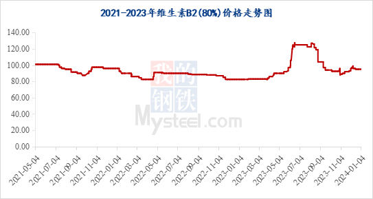 维生素B2:2023年全年市场均价97.6元/kg ,较上年均价同比上涨10元/kg ,涨幅11.4% 。 维生素市场一直延续偏弱态势,维生素B2是为数不多的价格波动较大的产品之一。上半年维生素B2工厂相关信息较多,由于下游需求不旺,供需失衡,价格平稳震荡,至年中工厂再次提高出厂价,市场货源供应开始趋紧,不少终端用户加大备货量,市场价格快速拉升,涨至年内最高水平。随后续维生素市场发展受大经济环境弱势影响,叠加下游需求仍显不足,对价格持续上涨难起支撑,价格开始下滑,维生素B2价格由年初的83元/kg小幅调整至年末的94元/kg,整体价格先涨后跌,较年初价格小幅上调。预计2024年一季度维生素B2市场维持弱稳运行,虽出口情况好转,呈恢复性增长,但供需失衡仍难以缓解,预计价格偏稳趋弱震荡为主。