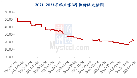 维生素C:2023年全年市场均价20.4元/kg ,较上年均价同比下降9.7元/kg ,跌幅32.2% 。2023年Vc市场先抑后扬,国内供大于求矛盾愈发严重,市场竞争激烈,加上国外市场需求不振,价格持续下跌,刷新历史新低 。自11月后国内工厂停报,Vc市场持续发酵,国外市场需求好转,价格上调迅速,以涨至年初水平。维生素C价格由年初的24元/kg小幅调整至年末的22元/kg。预计2024年一季度维生素C市场维持弱稳运行,价格平缓震荡为主,关注国内厂家动态及国外市场需求情况。