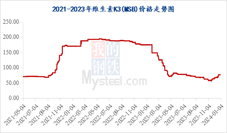 维生素K3:2023年全年市场均价90元/kg ,较上年均价同比下降95.2元/kg ,跌幅51.4% 。自年初起,维生素K3市场开机率逐渐回升,市场竞争激烈,上游原材料成本下降,下游需求不振,K3市场价格下滑严重,自年初到年中,K3(MSB)市场主流价格从160元/kg左右下调至58元/Kg附近。下半年K3市场维持偏弱震荡态势,至年末受原材料紧缺及成本上升影响,市场供货略显紧张,市场价格有所回暖,小幅上调。维生素K3(MSB)价格由年初的160元/kg 附近跌至年末77元/kg 左右,(MNB)价格由年初的175元/kg 附近跌至年末88元/kg 左右。预计2024年一季度维生素K3市场呈平稳稍强态势,受原材料紧缺及成本影响,市场价格将有所回升,持续震荡格局。