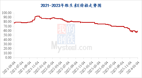 维生素E:2023年全年市场均价69.8元/kg ,较上年均价同比下降12.9元/kg ,跌幅15.6% 。 今年以来市场震荡下行,价格整体持续下滑,今年年初维生素E市场价格在76元/kg 附近,但由于需求端的持续弱势,市场价格平缓趋弱下行;下半年上游工厂维生素E产线相关信息较多,由于下游需求不旺,对市场影响有限,对价格难起支撑作用,截止年末维生素E价格仍在低位震荡。维生素E价格由年初的76元/kg小幅调整至年末的60元/kg,基本全年维持偏弱态势。预计2024年一季度维生素E市场平稳震荡为主,各厂家停产检修,按销定产,市场供需趋于平衡,对市场价格呈利好趋势,关注后期工厂出货情况。