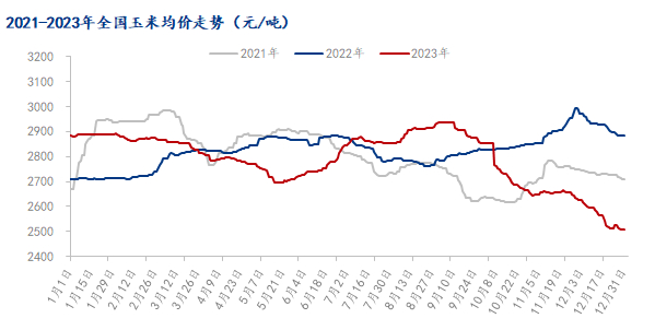 2023年全国玉米市场价格运行呈现“跌-涨-跌”的趋势,大致分为三个阶段。