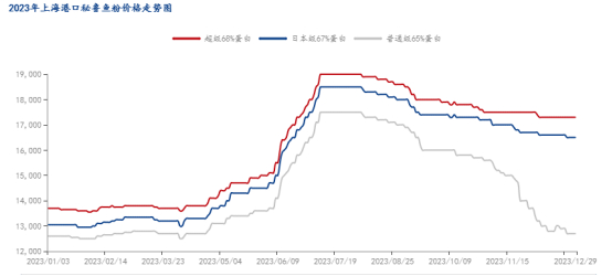 从价格方面来看,以上海市场为例,截至12月末,2023年秘鲁超级鱼粉价格为17300-17500元/吨,年内低点价格为13600元/吨,年内高点价格涨至19000元/吨,年均价16259元/吨,年均价较2022年均价相比下跌3621元/吨,同比跌幅为28.65%。