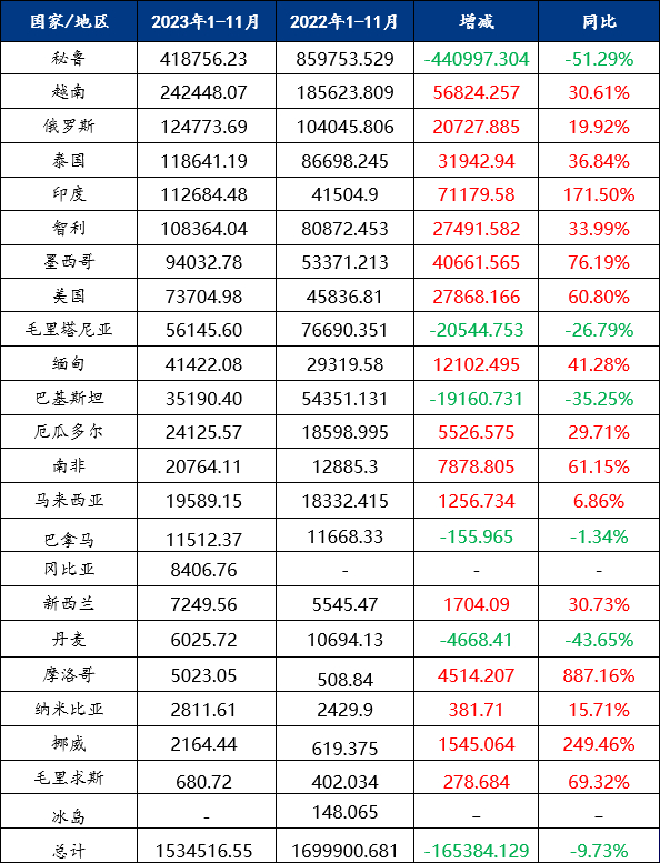 2023年第三季度全国港口鱼粉库存数量受秘鲁当季配额数量低位影响,进口鱼粉到港数量明显减少。叠加市场购销氛围活跃,港口出货大幅增加。港口库存自5月底27.5万吨高位,一路8月中旬下降至本年度第一个库存低点13.7万吨。随着下游第二季度完成一波采购计划,叠加鱼粉陆续到港以及市场观望国产鱼粉开海生产情况,港口库存小幅止跌回调。不过之后由于鱼粉进口数量进一步减少,持续消耗港口库存,在10月中旬迎来2023年库存最低点,库存数量为13万吨。2023年秘鲁鱼粉进口数量仅为41.87万吨,较2022年减少46万吨,同比降幅52.35%。预估2023年第三方国家鱼粉补充了17-18万吨左右的需求缺口。