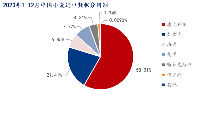 从1-12月份总进口量分国别来看,我国小麦进口国主要是澳大利亚、加拿大、美国、法国、哈萨克斯坦、俄罗斯。澳大利亚进口量693.74万吨,占到总进口量的58.31%;加拿大进口量254.72万吨,占到总进口量的21.41%;美国进口量92.42万吨,占到总进口量的7.77%;法国进口量81.48万吨,占到总进口量的6.85%;哈萨克斯坦进口量51.27万吨,占到总进口量的4.31%;俄罗斯进口量15.99万吨,占到总进口量的1.34%。