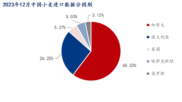 从进口国来看,2023年12月,我国小麦进口国主要是加拿大、澳大利亚、美国、哈萨克斯坦、俄罗斯。加拿大进口量34.94万吨,占到总进口量的60.33%;澳大利亚进口量15.2万吨,占到总进口量的26.25%;美国进口量3.05万吨,占到总进口量的5.27%;哈萨克斯坦进口量2.91万吨,占到总进口量的5.03%;俄罗斯进口量1.8万吨,占到总进口量的3.12%。