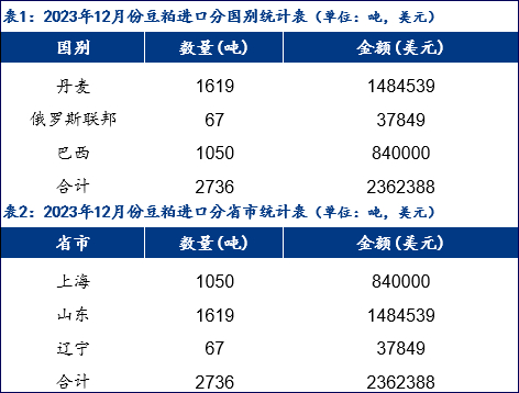 具体分区域来看,中国12月豆粕进口来源国家为丹麦、巴西、俄罗斯三国,其中12月从丹麦进口豆粕1619吨,占比59%;从巴西进口豆粕1050吨,占比38%;从俄罗斯进口豆粕67吨,占比2%。