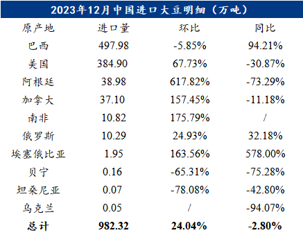 其中,巴西仍为当月最大供应国,当月从巴西进口大豆497.98万吨,均为转基因大豆,环比减少5.85%,同比增加94.21%。往年四季度,国内进口大豆基本以美国供应主导,但巴西大豆供应量庞大、具有吸引力的价格使得中国买家加大了采购力度。数据显示,2023年1-12月我国自巴西进口的大豆量为6996.04万吨,比去年同期的5439.82万吨增加28.61%,占2023年我国进口大豆总量的70%。