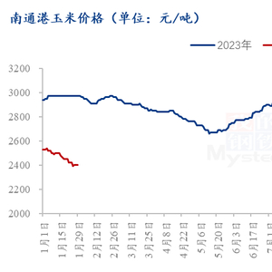 自去年四季度至今年1月30日,江苏南通港玉米价格共下跌480元/吨,下跌幅度骇人。截止到1月30日,江苏南通港二等玉米价格为2400元/吨,同比下跌570元/吨,跌幅19.20%。