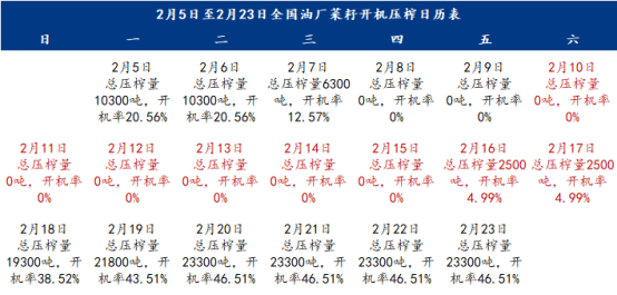 据Mysteel调研显示,2024年第4周(1月27日至2月2日)沿海地区主要油厂菜籽压榨预估8.26万吨,开机率预估23.55%;而春节当周沿海地区菜籽工厂普遍停机,基本至春节后(正月初九)开机,开机率在0%-20%,2月5日至2月23日的平均开机率在17%左右,随着假期临近,全国开机率预计将大幅下调。