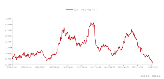 今年国内菜粕现货价格可谓不尽人意,整个四季度国内菜粕价格跟随豆粕价格开启下跌之路,其中截至1月31日,菜粕全国均价为 2480元/吨,较23年12月下跌 415 元/吨,跌幅 14.34%。