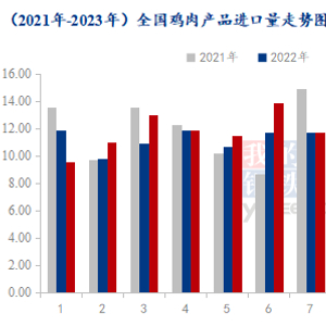 据海关总署数据统计,2023年12月份鸡肉产品进口量为8.69万吨,环比跌幅2.25%,同比跌幅19.98%。2023年鸡肉产品进口量为130.24万吨,同比2022年仅减少0.18万吨,减量0.13%。12月份鸡肉进口量环比减量,整个四季度进口量都呈递减,但减幅有限的状态。