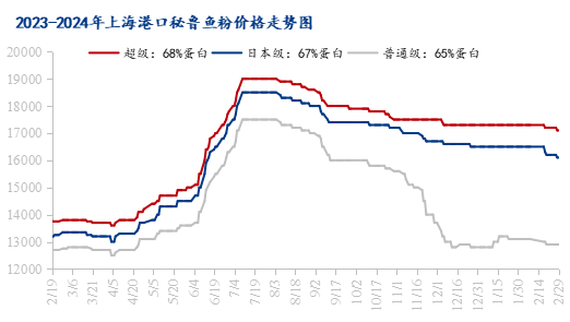 从进口方面看,以上海港市场为例,截至2月29日,秘鲁超级鱼粉主流价格为17100-17200元/吨,日本级鱼粉主流价格为16100-16300元/吨左右,普通级鱼粉主流价格为12800-13000元/吨,环比上月下调200-300元/吨。节后归来下游询单意愿不强,饲企消耗自身库存为主,叠加港口陆续到新货,供大于求情况明显,市场成交表现羸弱。