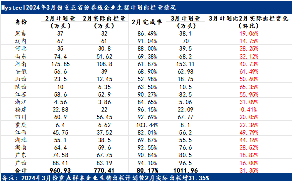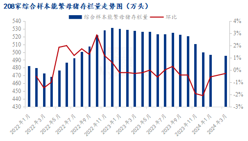 据上海钢联数据显示,2024年2月208家综合样本的能繁母猪存栏量为495.77万头,环比小跌0.28%(1月环比跌0.56%),降幅缩窄;其中123家规模场能繁母猪存栏量环比下跌0.26%,85家散户存栏量环比下跌0.90%,降幅都较上个月出现缩窄的情况,主要在于市场对于后期猪价有所看好,尤其是下半年的市场行情,同时2月处于春节前后,节前猪价表现较为可观,节后虽有回落,但由于春节后人员流动,处于防控安全考虑减少车辆流动,淘汰积极性也会出现一定下降;同时就区域分布来说,华南、西南以及西北等地养殖场有存在一定增量,同时北方疫情零星散发,部分企业存在一定产能去化,整体月度降幅是小幅缩窄的。其实这也可以说明市场现在去化速度在放缓,部分产业群体对后市猪价仍较为看好。