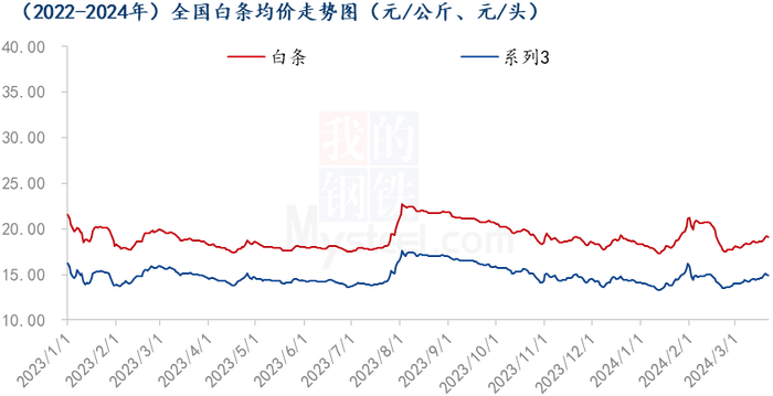 3月是猪肉传统的消费淡季,白条主要供应鲜销为主,而目前冻品库存较高,厂家无法通过入库来缓解销售阻力,只有通过以销定宰控量生产或者提涨白条价格来解决。Mysteel农产品监测的国内重点屠宰企业冻品库容率仍处于24.23%高位,厂家白条走货很慢,目前厂家开工率也维持在26.0-27.0%水平,同比低2.49%,差距主要还是去年屠企厂家开始积极分割入库。