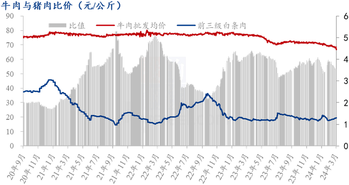 从数据来看,3月全国牛肉批发市场均价月均价为68.65元/公斤,环比下跌1.69%,同比下跌10.97%。其中高点出现在3月5日,为69.87元/公斤;最低点为66.90元/公斤,出现在3月28日。3月全月牛肉市场价格呈现加速下跌的的趋势。