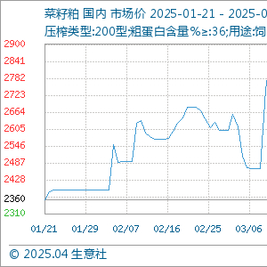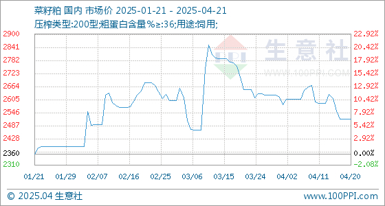 4月21日,生意社菜籽粕基准价为2518.33元/吨,与本月初(2616.67元/吨)相比,下降了-3.76%。