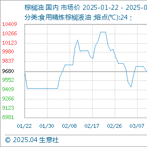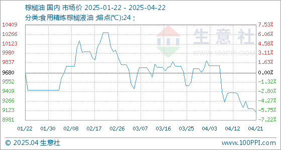 4月22日,生意社棕榈油基准价为9100.00元/吨,与本月初(9700.00元/吨)相比,下降了-6.19%。