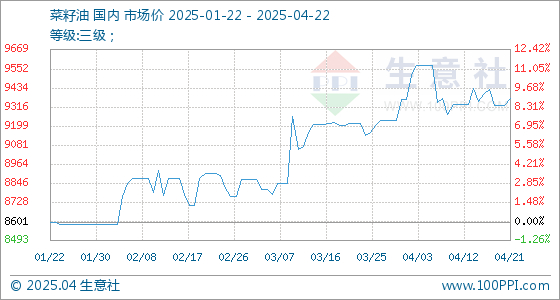4月22日生意社菜籽油基准价为9366.67元/吨