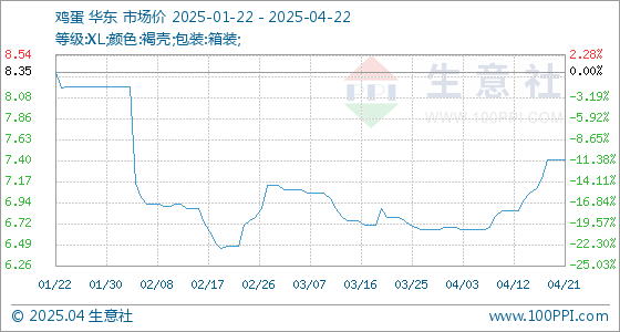 4月22日,生意社鸡蛋基准价为7.40元/公斤,与本月初(6.68元/公斤)相比,上涨了10.78%。