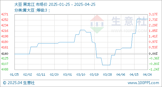 4月25日,生意社大豆基准价为4256.00元/吨,与本月初(4136.00元/吨)相比,上涨了2.90%。