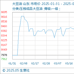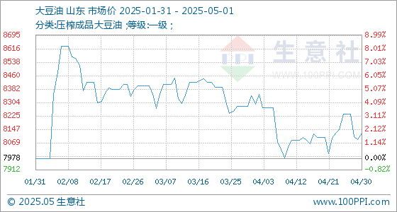 5月1日,生意社大豆油基准价为8126.00元/吨,与上月初(8342.00元/吨)相比,下降了-2.59%。