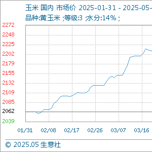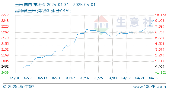 5月1日,生意社玉米基准价为2252.86元/吨,与上月初(2194.29元/吨)相比,上涨了2.67%。