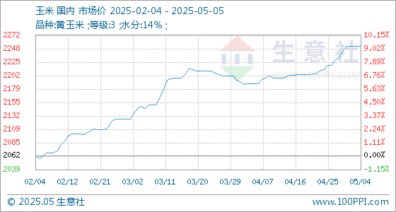 5月5日,生意社玉米基准价为2252.86元/吨,与本月初持平。