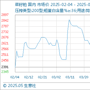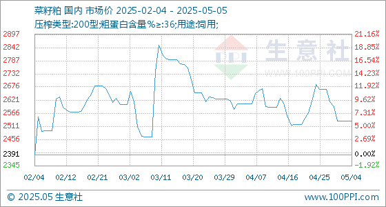 5月5日,生意社菜籽粕基准价为2531.67元/吨,与本月初持平。