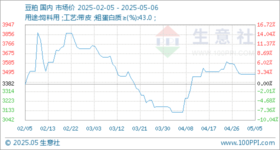 5月6日,生意社豆粕基准价为3476.67元/吨,与本月初持平。
