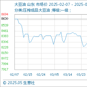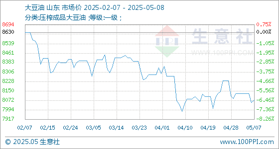 5月8日,生意社大豆油基准价为8076.00元/吨,与本月初(8126.00元/吨)相比,下降了-0.62%。