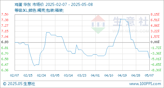 5月8日,生意社鸡蛋基准价为6.60元/公斤,与本月初(6.75元/公斤)相比,下降了-2.22%。
