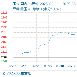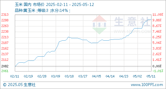 5月12日,生意社玉米基准价为2292.86元/吨,与本月初(2252.86元/吨)相比,上涨了1.78%。