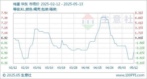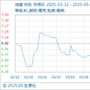 5月13日,生意社鸡蛋基准价为6.62元/公斤,与本月初(6.75元/公斤)相比,下降了-1.93%。