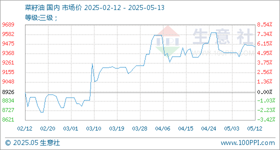 5月13日生意社菜籽油基准价为9446.67元/吨
