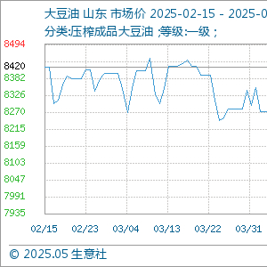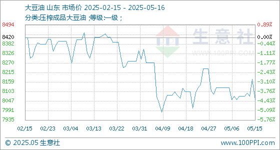 5月16日,生意社大豆油基准价为8054.00元/吨,与本月初(8126.00元/吨)相比,下降了-0.89%。