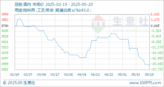 5月20日,生意社豆粕基准价为2972.00元/吨,与本月初(3476.67元/吨)相比,下降了-14.52%。