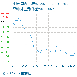 5月20日,生意社生猪基准价为14.62元/公斤,与本月初(14.83元/公斤)相比,下降了-1.42%。