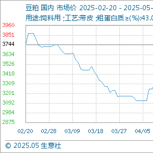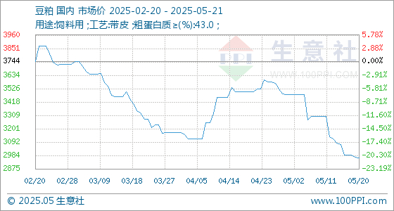 5月21日,生意社豆粕基准价为2966.00元/吨,与本月初(3476.67元/吨)相比,下降了-14.69%。