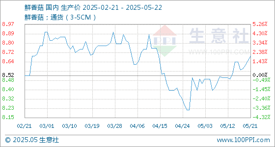 5月22日,生意社鲜香菇基准价为8.69元/公斤,与本月初(8.39元/公斤)相比,上涨了3.58%。